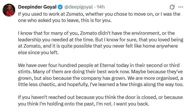 Deepender Goyal Calls Ex-employees Back: कोई भी कंपनी जब अपने कर्मचारियों को हटाती है तो उस समय चाहे जो भी वजह बताई जाए, लेकिन पूर्व कर्मचारियों को लेकर एक भावनात्मक जुड़ाव बना रहता है. एटरल (पूर्व में जोमैटो) के फाउंडर और वाइस चेयरमैन दीपेन्द्र गोयल ने भी अपने पूर्व कर्मचारियों के लिए सोशल मीडिया प्लेटफॉर्म एक्स पर एक भावुक पोस्ट साझा करते हुए उन्हें दोबारा लौटने का न्योता दिया है.