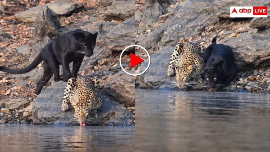 बताया जा रहा है कि यह दृश्य जंगल के एक प्राकृतिक जलस्रोत के पास का है, जहां अक्सर जंगली जानवर प्यास बुझाने पहुंचते हैं. वीडियो में साफ देखा जा सकता है कि एक सामान्य तेंदुआ और एक ब्लैक पैंथर साथ-साथ चट्टानों पर बैठे हैं और पानी पी रहे हैं. दोनों बेहद सतर्क नजर आ रहे हैं, लेकिन उनके बीच किसी तरह का टकराव दिखाई नहीं देता. तेंदुआ पहले से ही वहां पानी पी रहा है, तभी अचानक ब्लैक पैंथर भी वहां आकर तेंदुए के साथ पानी पीने लगता है. हालांकि तेंदुआ जब ब्लैक पैंथर को देखता है तो वो रिएक्ट ही नहीं करता बल्कि खामोशी से दोनों साथ पानी पीने लगते हैं.