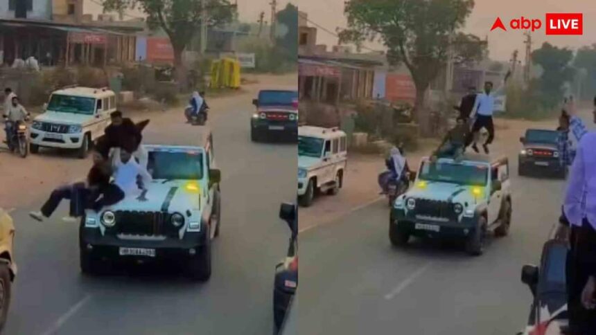 थार के बोनट पर खड़े होकर मचा रहे थे बवाल, अचानक लगे ब्रेक और… आप भी बोलेंगे- सही हुआ