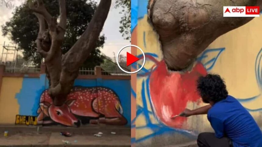 यूनिवर्सिटी की जिस दीवार पर पहले उखड़ा हुआ रंग और दरारें नजर आती थीं, वहां अब एक खूबसूरत हिरण का म्यूरल लोगों का ध्यान खींच रहा है. लाल रंग में बना हिरण आराम करती मुद्रा में दिखाई देता है, जिसकी आंखों की मासूमियत और बारीक ब्रश स्ट्रोक्स पेंटिंग को जीवंत बना देते हैं. सबसे खास बात यह है कि पास खड़ा विशाल पेड़ इस कलाकृति का हिस्सा बन गया है. पेड़ का तना और शाखाएं ऐसे प्रतीत होती हैं जैसे वह हिरण को प्राकृतिक छाया दे रही हों. कला और प्रकृति का यह मेल इस म्यूरल को साधारण दीवार पेंटिंग से कहीं ज्यादा खास बना देता है. गुवाहाटी के कलाकार भेजाल ने इस पेंटिंग को बनाने की पूरी प्रक्रिया अपने इंस्टाग्राम पर एक वीडियो के जरिए शेयर की है जो कि अब सोशल मीडिया पर तेजी से वायरल हो रही है.
