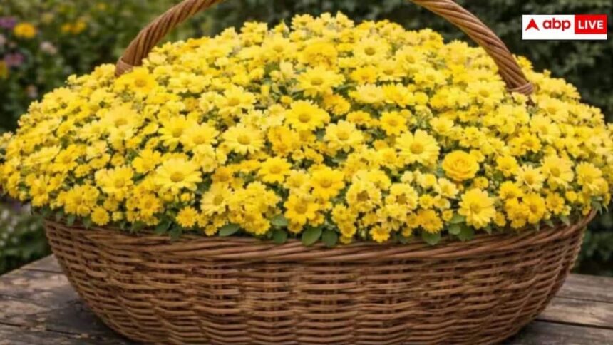 तस्वीर में जो छोटे-छोटे पीले फूल नजर आ रहे हैं, वे मुख्य रूप से क्राइसेंथेमम यानी गुलदाउदी के फूल हैं. ये फूल घने और परतदार पंखुड़ियों वाले होते हैं, जो दूर से लगभग एक जैसे दिखाई देते हैं. इन्हीं के बीच एक अलग बनावट वाला पीला गुलाब छिपा हुआ है, जिसकी पंखुड़ियां गोलाई में सजी होती हैं और आकार में बाकी फूलों से थोड़ी अलग दिखती हैं.