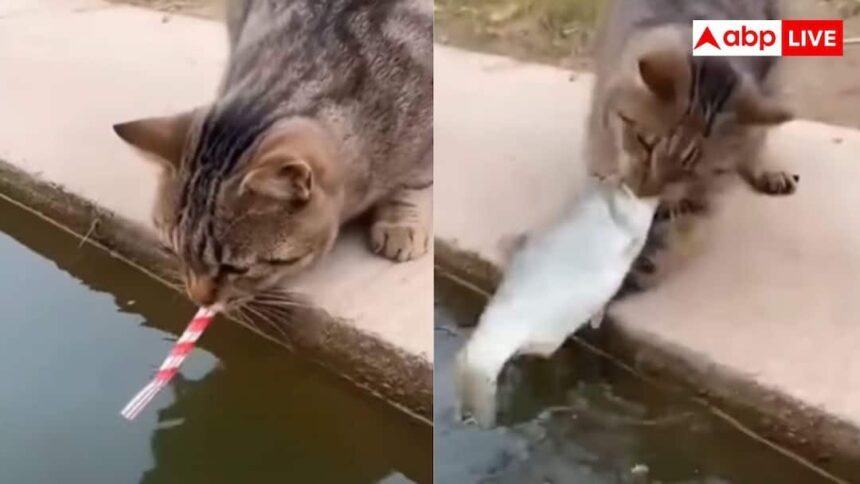 मुंह में स्ट्रॉ लगाई और तालाब से बिल्ली ने पकड़ ली मछली, वायरल वीडियो देख आप भी पकड़ लेंगे माथा
