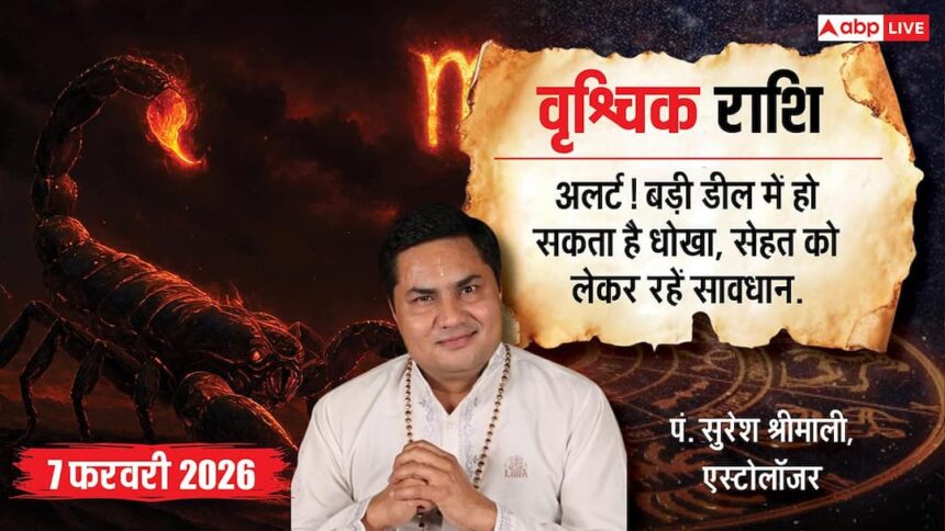 Vrishchik Rashifal 7 February 2026 in Hindi: आज चंद्रमा दोपहर 01:22 तक आपकी राशि से 11वें भाव (Income House) में रहेंगे, जिसके बाद वे 12वें भाव में प्रवेश करेंगे. 11वें भाव का चंद्रमा आपको धन लाभ और मित्रों का सहयोग दिलाएगा. शूल योग के प्रभाव से आपके पुराने अटके हुए काम पूरे होंगे और समाज में आपकी प्रतिष्ठा बढ़ेगी.
