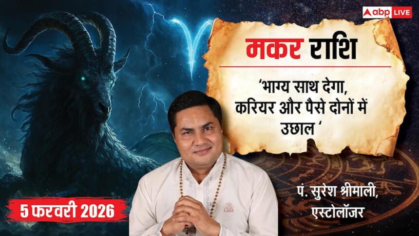 Makar Rashifal 5 February 2026 in Hindi: आज चंद्रमा के नवम भाव में होने से मकर राशि वालों के लिए भाग्य, धर्म और उच्च विचारों से जुड़ा दिन रहेगा. धार्मिक कार्यों में सफलता मिलेगी और मन भी सकारात्मक रहेगा. सुकर्मा योग रुके हुए आर्थिक और प्रोफेशनल कामों को आगे बढ़ाने में मदद करेगा.