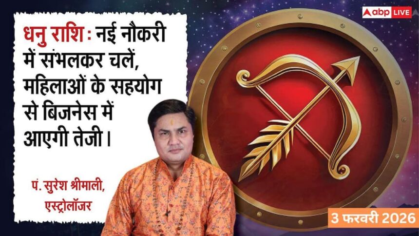 Dhanu Rashifal 3 February 2026 in Hindi: धनु राशि वालों के लिए आज का दिन आत्म-सुधार और धार्मिक कार्यों में रुचि बढ़ाने वाला है. आपकी राशि का स्वामी गुरु आज आपको सही दिशा में निर्णय लेने की प्रेरणा देगा. आज आप किसी लंबी दूरी की यात्रा या किसी धार्मिक अनुष्ठान की योजना बना सकते हैं. मन में उत्साह बना रहेगा, जिससे कठिन कार्य भी आसानी से पूरे होंगे.