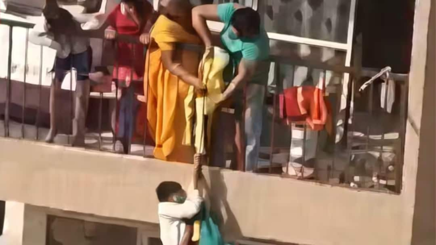 Woman living on 4th floor saw her saree fall down in the balcony of the third floor house.