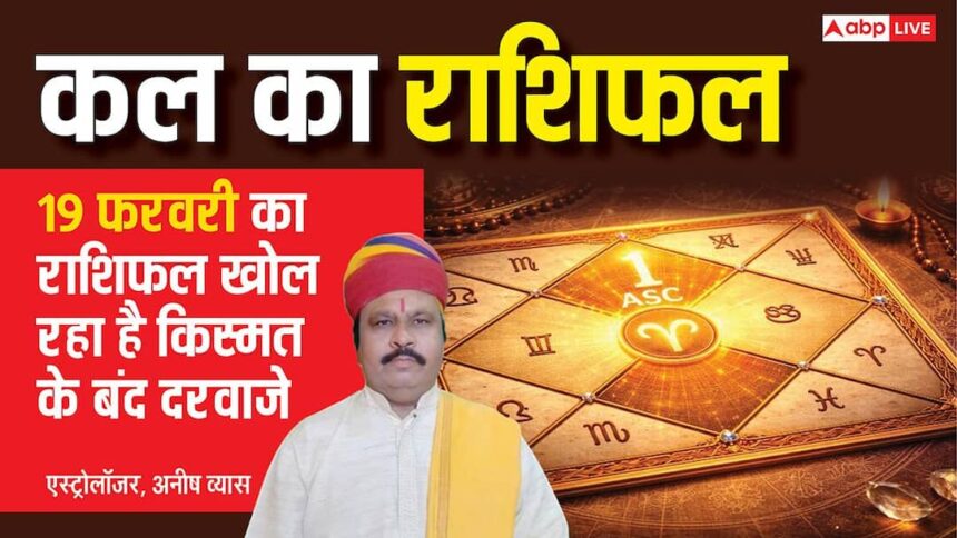 Horoscope Tomorrow 19 February 2026, Kal Ka Rashifal: राशिफल के अनुसार, 19 फरवरी 2026 का दिन कुछ राशियों के लिए अवसर लेकर आएगा, तो कुछ को सतर्क रहने की जरूरत होगी. करियर, व्यापार, स्वास्थ्य और पारिवारिक जीवन में किसे लाभ मिलेगा और किसे संभलकर चलना होगा, आइए जानते हैं कल का राशिफल.