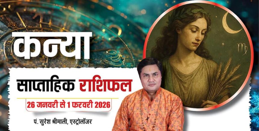 Kanya Weekly Horoscope 26 January to 1 February 2026: कन्या राशि के लिए यह नया सप्ताह मिश्रित रहेगा. सुरक्षा और सतर्कता जरूरी है, वाहन संभालें और अपने सामान की देखभाल करें. धार्मिक, पारिवारिक और सामाजिक कार्यों में व्यस्तता रहेगी. अचानक बड़ी धनराशि खर्च हो सकती है. परिवार या रिश्तेदारों से समय पर सहयोग न मिल सकता है, लेकिन बुद्धि और विवेक से चुनौतियां पार होंगी. कार्यक्षेत्र में समय शुभ है और प्रेम जीवन अनुकूल रहेगा. कन्या राशि वाले ज्योतिषाचार्य पंडित सुरेश श्रीमाली जी से जानें 26 जनवरी से 1 फरवरी 2026 तक अपना साप्ताहिक राशिफल.
