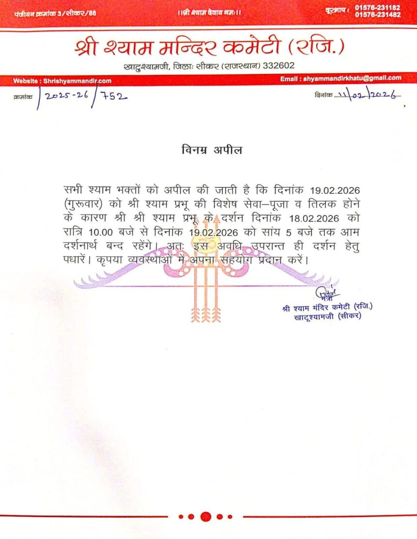मंदिर कमेटी की ओर से जारी की गई अपील में कहा गया है कि, सभी श्याम भक्तों को अपील की जाती है कि, गुरुवार 19 फरवरी 2026 को श्री श्याम प्रभू की विशेष पूजा-सेवा और तिलक श्रृंगार होने के कारण श्री श्री श्याम प्रभू के दर्शन दिनांक 18 फरवरी 2026 रात्रि 10 बजे से 19 फरवरी 2026 शाम 5 बजे तक आम दर्शनार्थ बंद रहेंगे. अत: इस अवधि उपरान्त ही दर्शन हेतु पधारें. कृपया व्यवस्थाओं में अपना सहयोग प्रदान करें.
