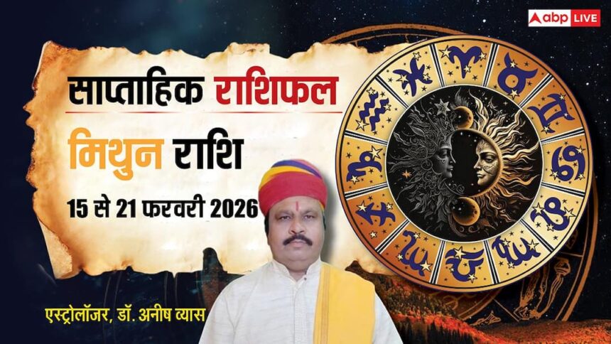 Mithun Weekly Horoscope 2026 (15 to 21 February): फरवरी 2026 महीने का तीसरा सप्ताह 15 से 21 फरवरी का समय मिथुन राशि के करियर, कारोबार, आर्थिक स्थिति, पारिवारिक व प्रेम जीवन और सेहत आदि के लिए यह सप्ताह कैसा रहेगा. मिथुन राशि वाले ज्योतिषाचार्य अनीष व्यास से जानें अपना भविष्यफल, यहां पढ़ें पूरा साप्ताहिक राशिफल.