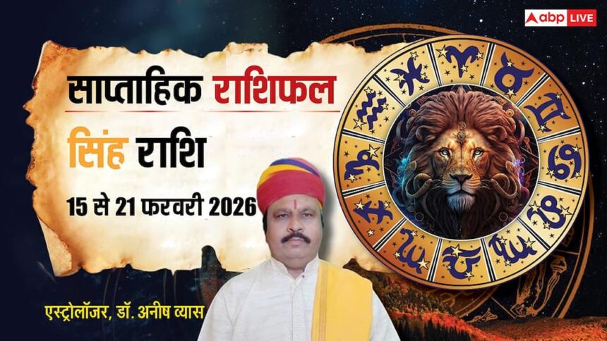 Singh Weekly Horoscope 2026 (15 to 21 February): फरवरी 2026 महीने का तीसरा सप्ताह 15 से 21 फरवरी का समय सिंह राशि के करियर, कारोबार, आर्थिक स्थिति, पारिवारिक व प्रेम जीवन और सेहत आदि के लिए यह सप्ताह कैसा रहेगा. सिंह राशि वाले ज्योतिषाचार्य अनीष व्यास से जानें अपना भविष्यफल, यहां पढ़ें पूरा साप्ताहिक राशिफल.