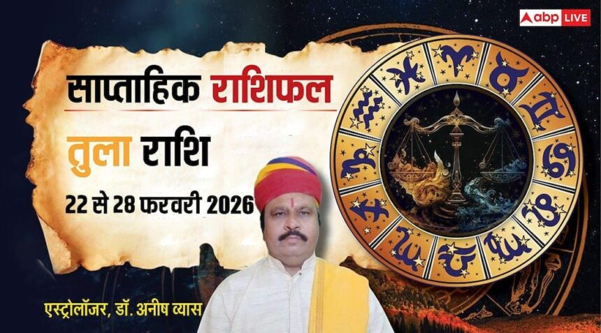 Libra Weekly Rashifal 2026 (22 to 28 February): फरवरी 2026 महीने का चौथा सप्ताह 22 से 28 फरवरी का समय तुला राशि के करियर, कारोबार, आर्थिक स्थिति, पारिवारिक व प्रेम जीवन और सेहत आदि के लिए यह सप्ताह कैसा रहेगा. तुला राशि वाले ज्योतिषाचार्य अनीष व्यास से जानें अपना भविष्यफल. यहां पढ़ें पूरा साप्ताहिक राशिफल.