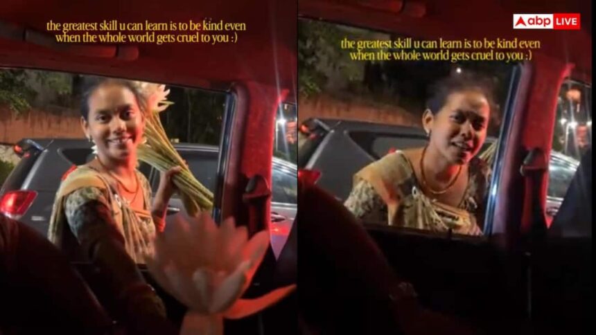 वीडियो में दिखाई पड़ता है कि बच्ची एक गाड़ी के पास पहुंची. अंदर बैठी महिला ने फूल लेने से बड़े प्यार से इंकार कर दिया, “हमें फूल नहीं चाहिए.” बच्ची ने न तो बहस की, न ही उसके चेहरे पर मायूसी आई. वह बस हल्के से मुस्कुराई. उसी मुस्कान के साथ उसने एक फूल उस महिला के हाथ में रख दिया और बहुत धीमी आवाज़ में कहा, “यह आपके लिए है दीदी.”