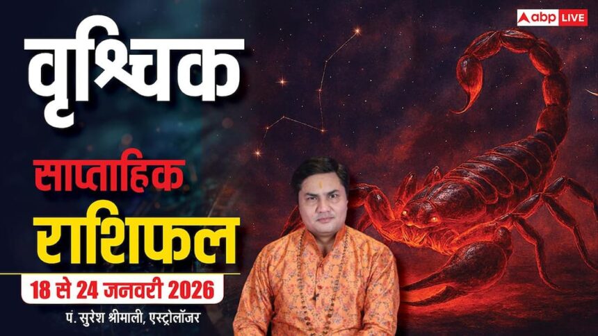 Vrishchik Weekly Horoscope 18 to 24 january 2026: यह सप्ताह वृश्चिक राशि वालों के लिए कामकाज के दबाव और मानसिक तनाव वाला रह सकता है. सप्ताह की शुरुआत में ही ऑफिस में जिम्मेदारियां बढ़ेंगी और सीनियर या जूनियर से किसी बात को लेकर अनबन की स्थिति बन सकती है. ऐसे हालात में आपको खुद को संयम में रखना होगा और छोटी-छोटी बातों को तूल देने से बचना होगा.